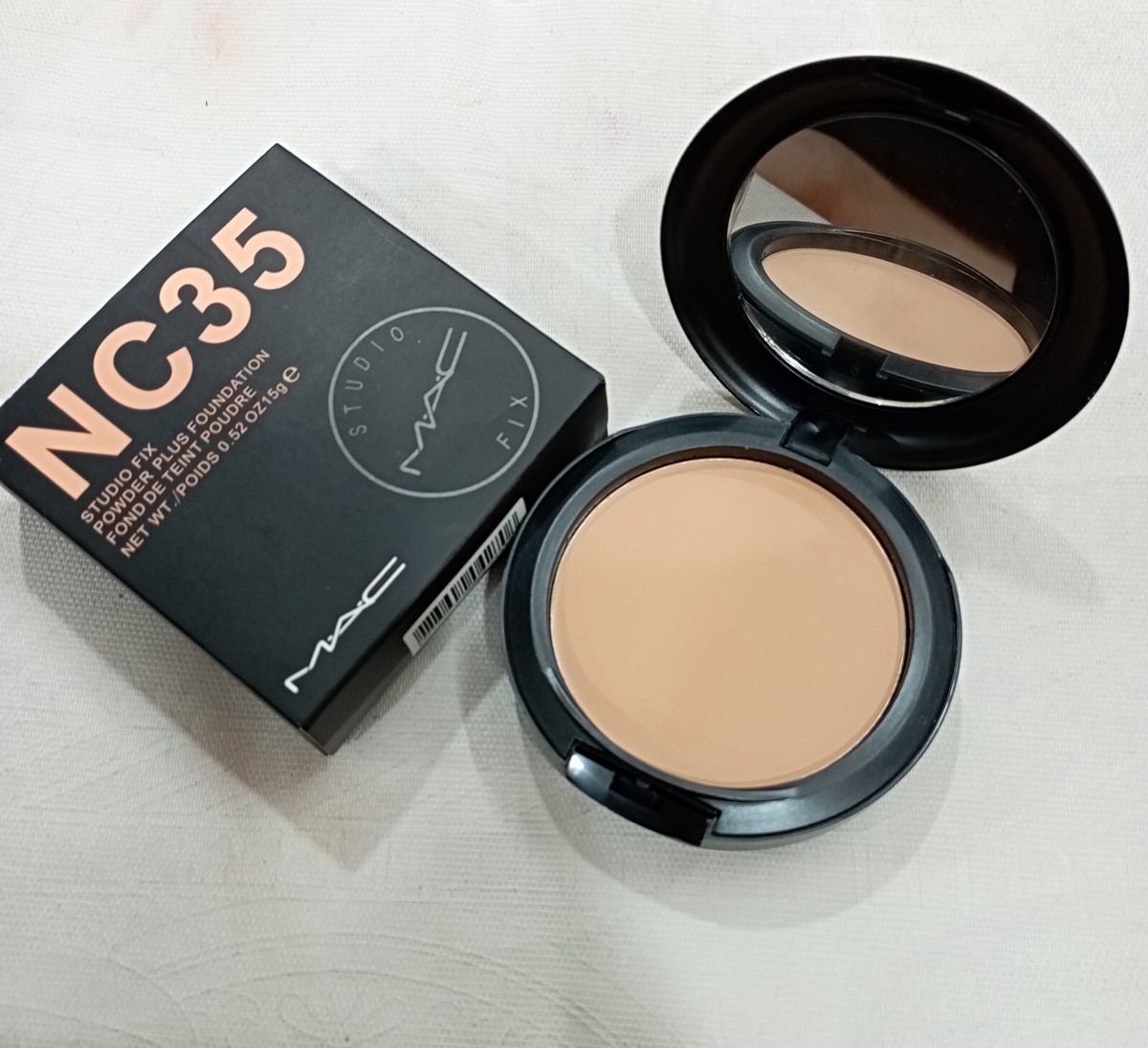MAC Studio Fix Powder Plus Foundation NC35 offers a matte, long-lasting finish with buildable coverage for medium skin tones with neutral-cool undertones.