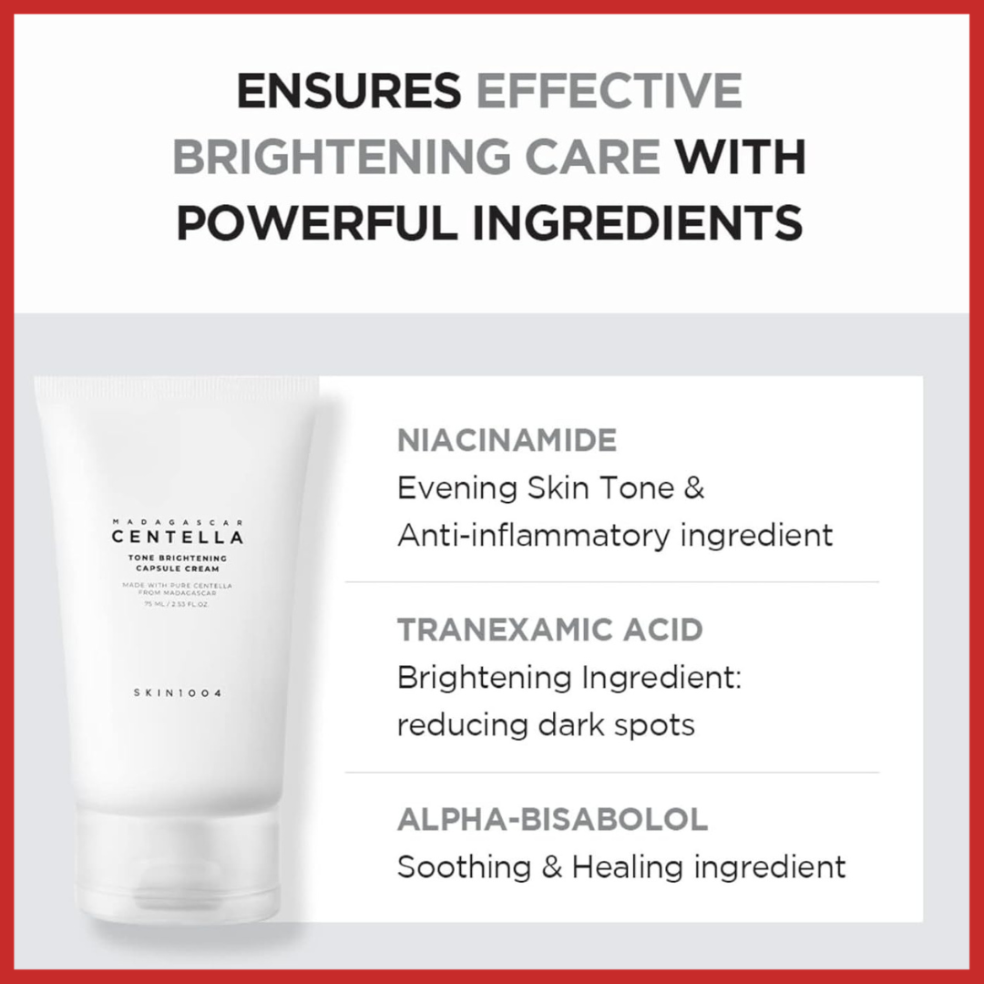This cream contains capsules containing madecassoside and a combination of ingredients found in natural centella asiatica from Madagascar that brightens dull skin. This daily cream has a fresh finish without any stickiness.Niacinamide: Evening Skin Tone & Anti-inflammatory ingredient.Tranexamic Acid: Brightening ingredient that helps to reduce dark spots.Alpha-Bisabolol: Soothing & healing ingredients.No Artificial fragrance / No Artificial colorant: Zero use of artificial fragrance and colorants that can cause skin irritation.Care-Free Use of Skin Irritation Tested Products.Care-free use for sensitive skin type.Skin irritation test implemented for enabling all skin type.